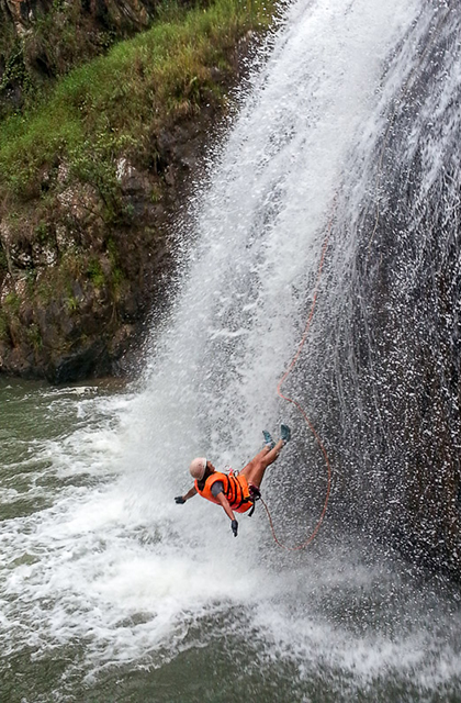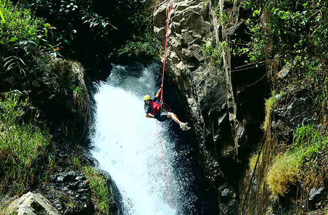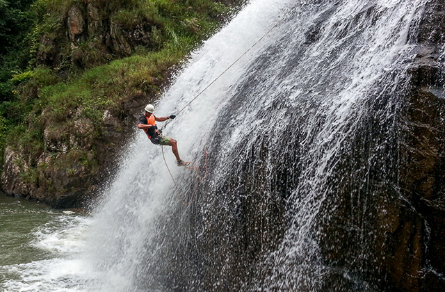 When the guides are satisfied that you’ve got it down, you’ll head down your first rappel. It is an exciting 15 meter descent into the river below, right next to a 30-meter beautiful waterfall.