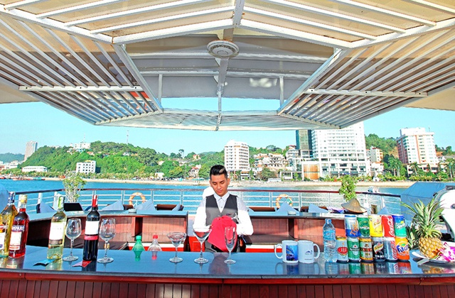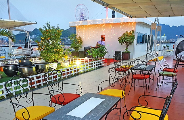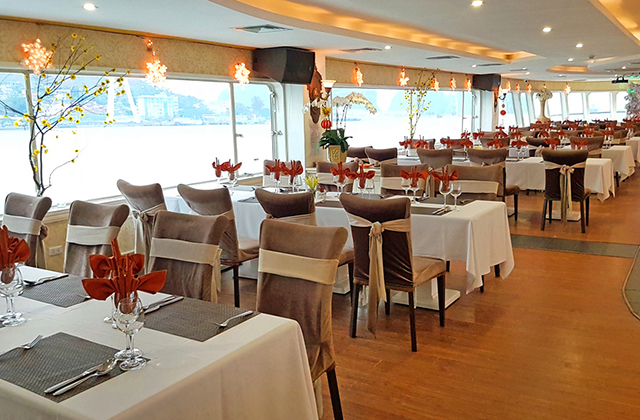 The Cruise is 100 % new, the entire frame is made of steel , painted in white,with new and stylish design with luxurious and state-of-the-art equipment. The cruise has a length of 60m & 14m width, with 2-storey restaurant for guests dining, banquet and conference facilities. There are two theatrical performances, the Foreign and Vietnam traditional band on each floor, special ethnic and belly dance will be arranged in the evening cruise. Buffet counter is placed in the middle of the restaurant, 2 Indoor Bars, 1 Sundeck Sky Bar on the third floor offer passengers a wide view for relaxing or taking photos on the Bay.