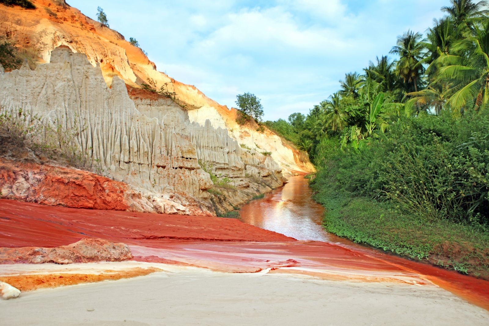 Next, we shall reach the Fairy stream - a photographic hotspot situated 18 km to the Northeast of Phan Thiet City. In fact, it’s not a swift-flowing stream you see nearby Hon Rom since it runs quite gently with the water level that is a bit higher than our ankles. Right under our feet, you can see the smooth sand and feel the lapping waves if taking off the shoes.